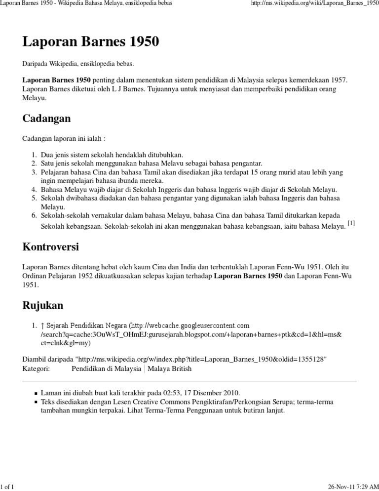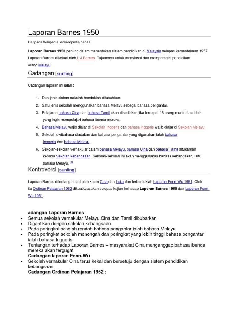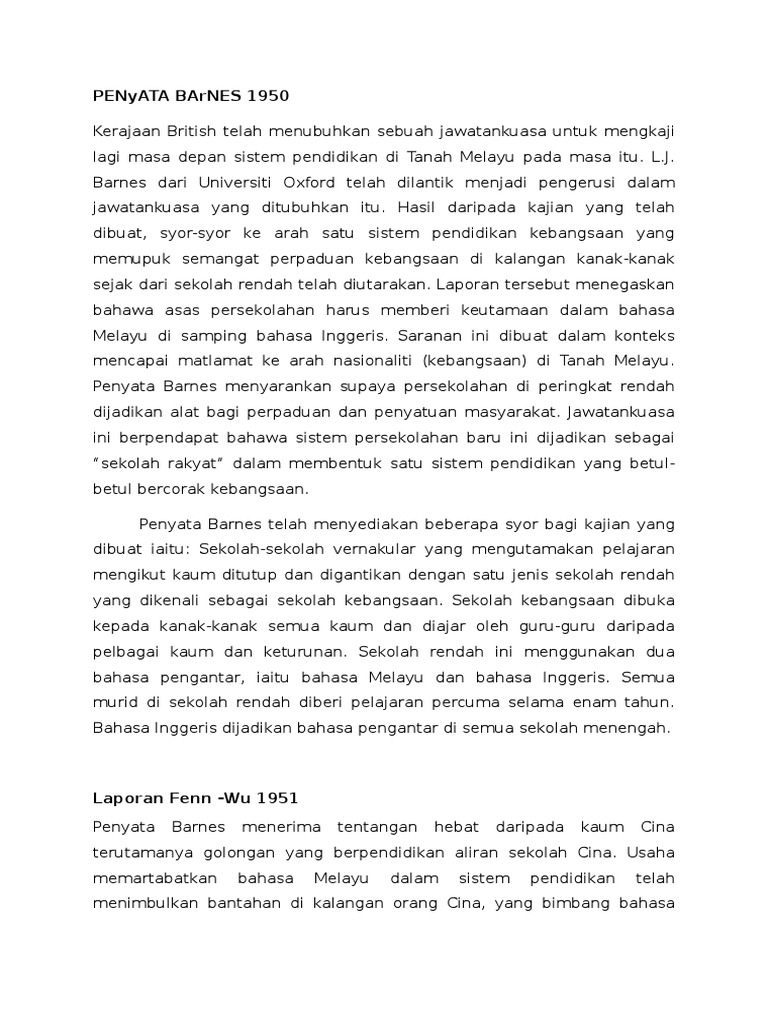 Di samping mempertahankan kedudukan bahasa cina, laporan ini juga ditugaskan untuk memberi nasihat tentang penyediaan buku teks sekolah cina yang berorientasikan. Persekutuan tanah melayu telah menyebabkan kerajaan bersetuju menubuhkan satu jawatankuasa yang diketuai oleh barnes, seorang profesor dan pengarah pusat latihan. Laporan barnes 1951 bertujuan untuk mengkaji dan memperbaiki bagi orang melayu tetapi gagal untuk sebarang penambahbaikan. Diteruskan secara berasing ,pendidikan seolah cina mesti berorientasikan tanah melayu. (1955) tidak diterima oleh penduduk tanah melayu. Laporan pendidikan cina di malaysia ini diketuai oleh dr. Use the download button below or simple online reader. Untuk mengkaji sistem pendidikan orang cina • cadangan : Keadaan ini menimbulkan perasaan kurang senang orang cina. Diterbitkan kerana bantahan masyarakat cina terhadap laporan barnes. Masyarakat cina bandar ketika itu menganggap laporan tersebut bertujuan menghapuskan bahasa cina dan kebudayaan cina. Fenn, dari setiausaha kerja bersekutu negara cina. Laporan razak 1956 laporan rahman talib 1960 dan akta pendidikan 1961 strategi dalam melaksanakan pembangunan pendidikan sekolah vernakular melayu yang didirikan oleh kerajaan british.